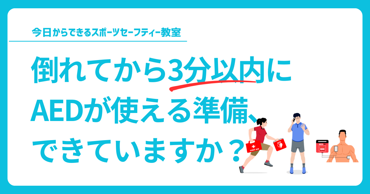 日本循環器学会と日本AED財団は「スポーツ現場における心臓突然死をゼロに」の提言のなかでスポーツ現場では3分以内にAEDを配置するよう発表しました。