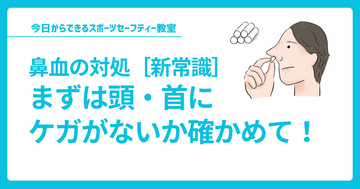 鼻以外に痛いところはないか、特に首に痛みがないか、めまいや頭痛などの脳振盪の症状がないかなど、鼻血の処置を行いながら並行して、頭や首のケガを疑うような症状を確認することが大切です。
