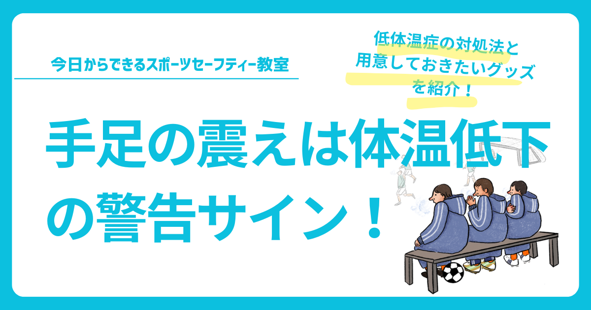 低体温症とは、身体の中心の温度(深部体温)が35℃まで下がった状態です。冬季のランニングトレーニングやサッカーの試合でベンチにいるときなどが起こりやすい状況です。低体温症を疑った場合には、寒い環境から隔離し、濡れている衣服の除去や水滴などの拭き取りをまず行います。